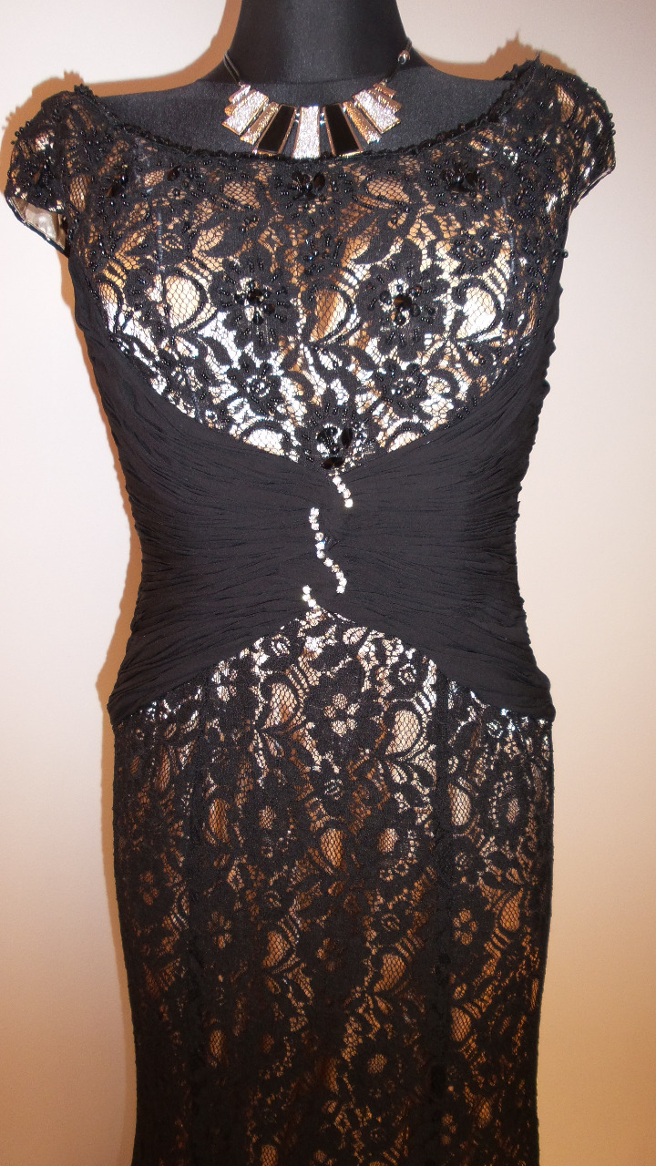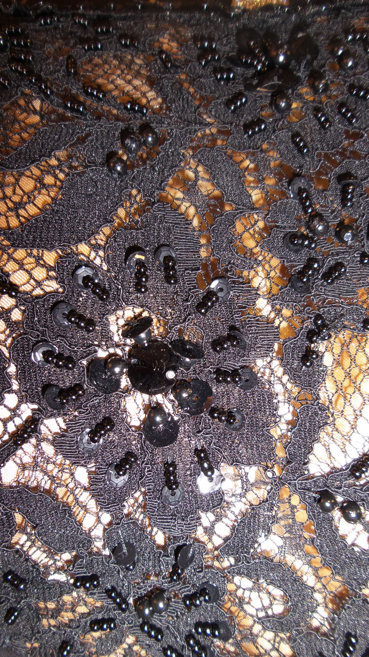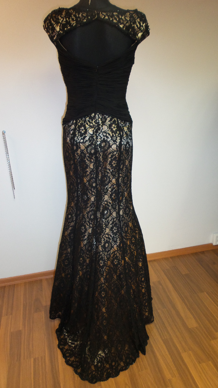 Luxusné krajkové šaty so zlatým saténovým podkladom. Strih je tvarovaný na postavu, od kolien sú šaty rozšírené s naznačenou vlečkou, tvar zabezpečujú 2 tylové vrstvy. V oblasti pásu je vkladaná mierne riasená čierna látka, v prednej časti zdobená štrasovými očkami. Krajka je v hornej časti a na spodnom leme sukne zdobená drobnými čiernymi korálikmi. Materiál 100%-ný polyester. Šaty je možné v kamennej predajni aj vypožičať. Veľmi doporučujeme!!!