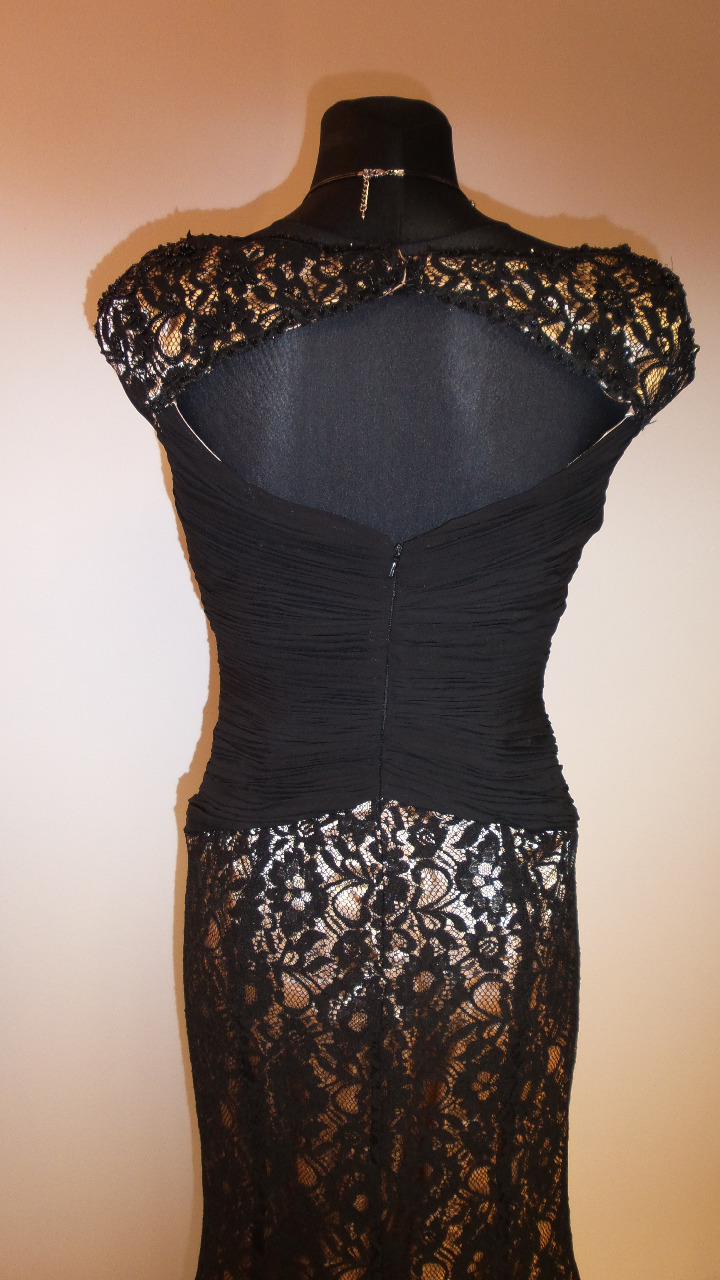 Spoločenské šaty. čierna krajka, zlatý saténový podklad, čiastočne odhalený chrbát, veľ 38-40